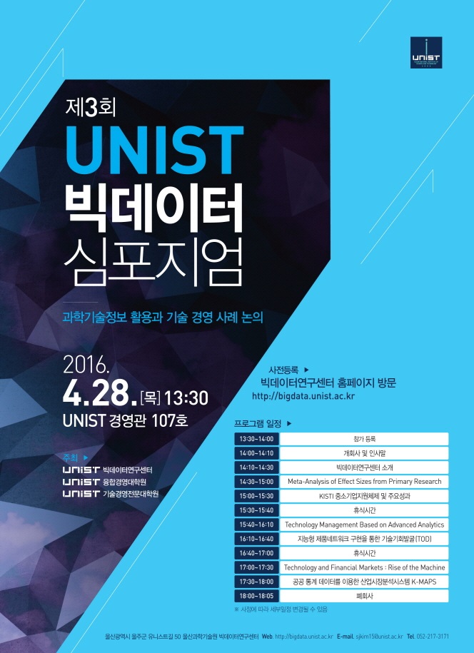 기술경영전문대학원에서는 빅데이터 연구센터 및 융합경영대학원 프로그램 홍보 및 관련 연구자간 교류확대와 산학연 네트워크 구축 및 확대를 위한 빅데이터 심포지움을 공동 개최